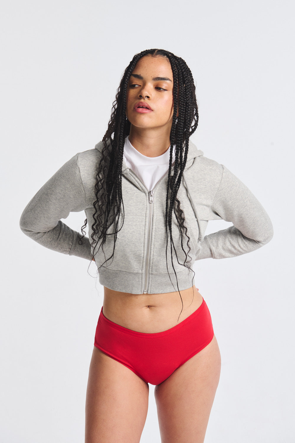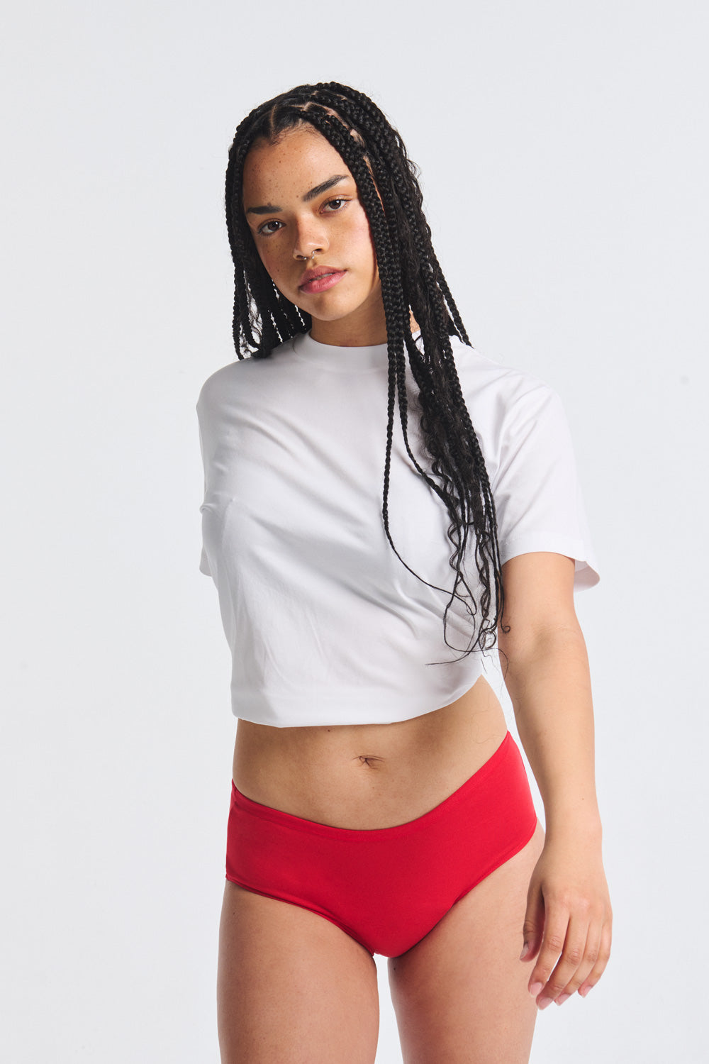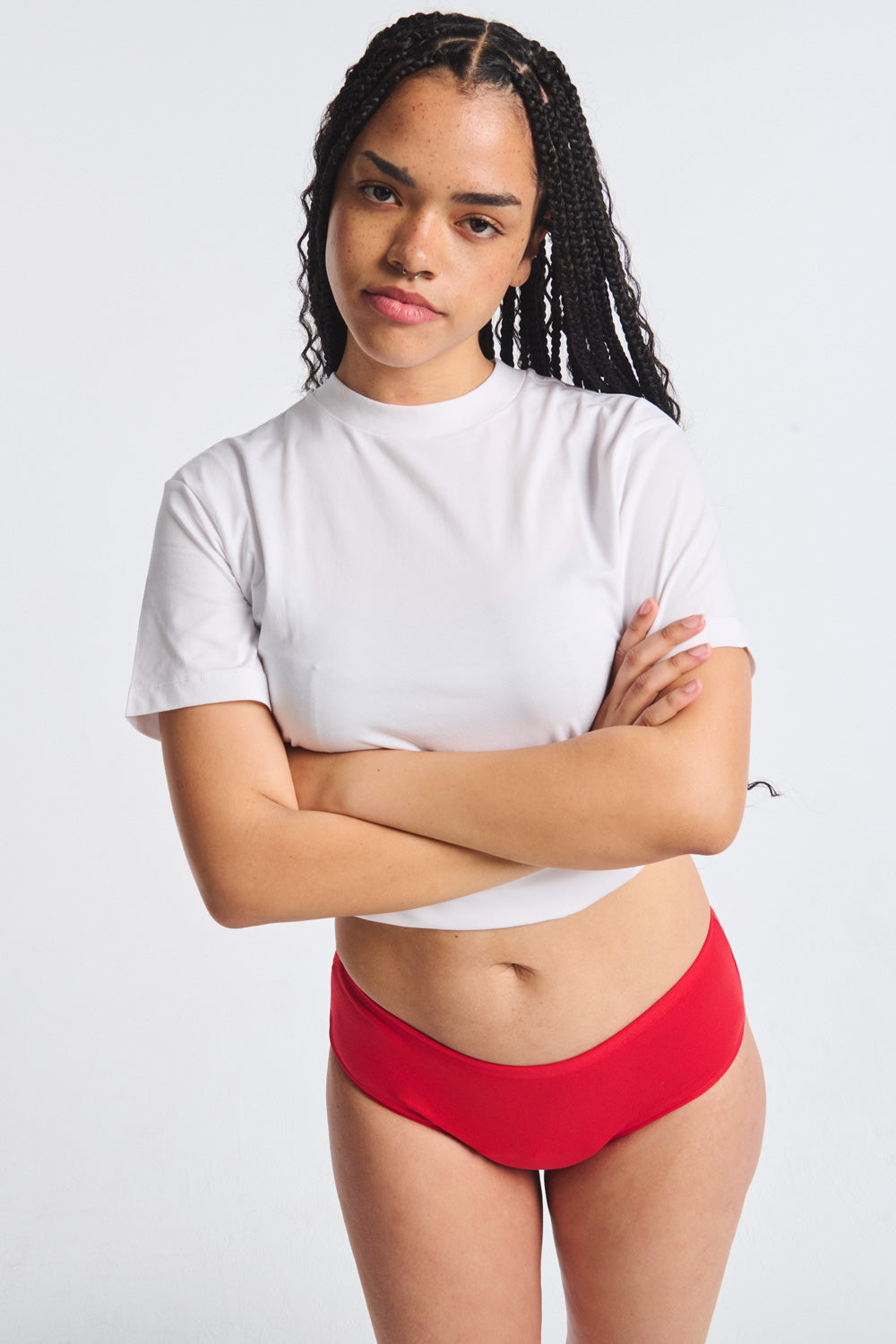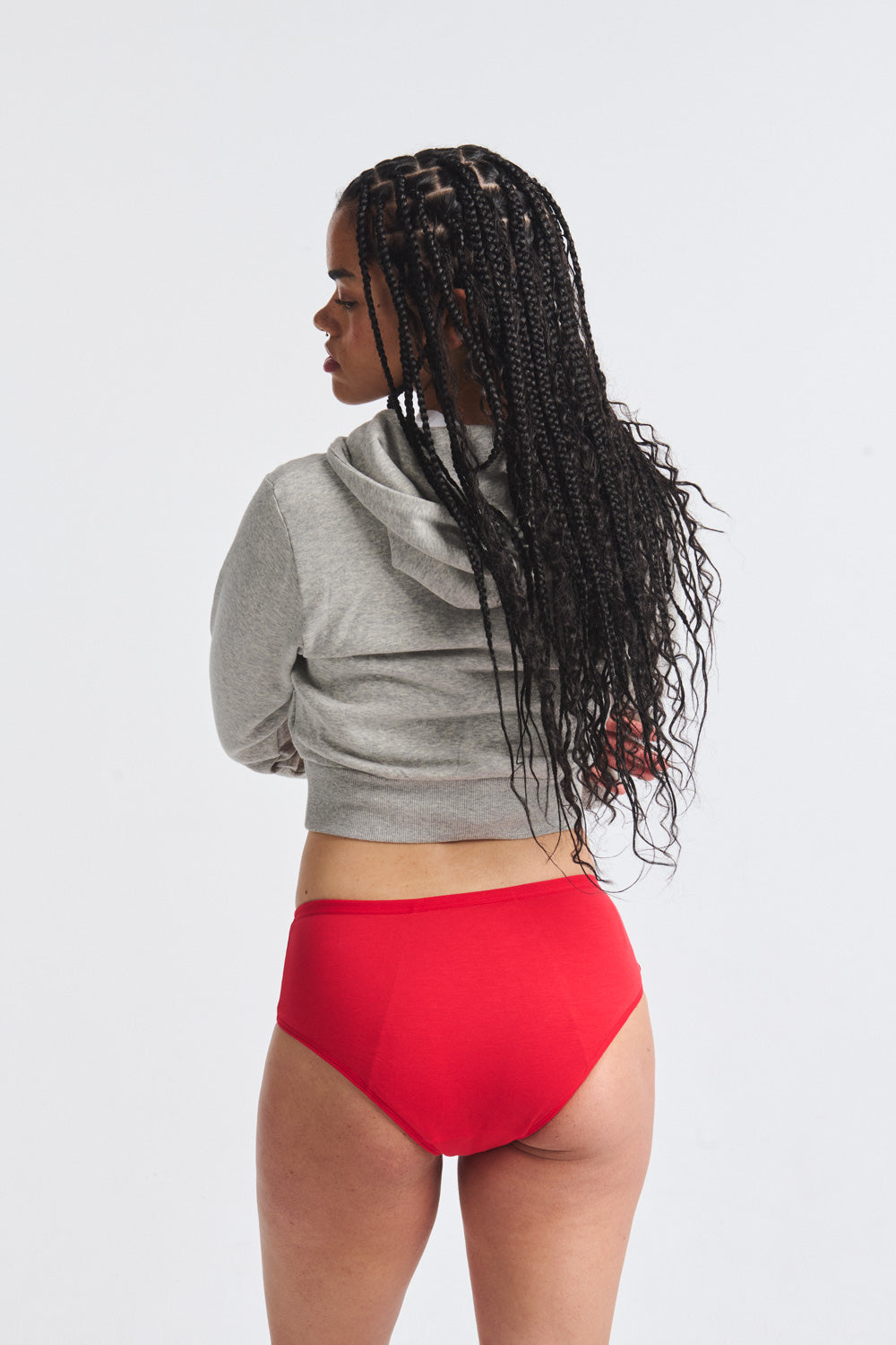 REPEAT propone la sua celebre mutandina mestruale nera per adolescenti, per tutti i flussi, in un nuovo rosso vivace, offrendo una soluzione efficace, comoda e alla moda che la tua adolescente merita durante il ciclo.