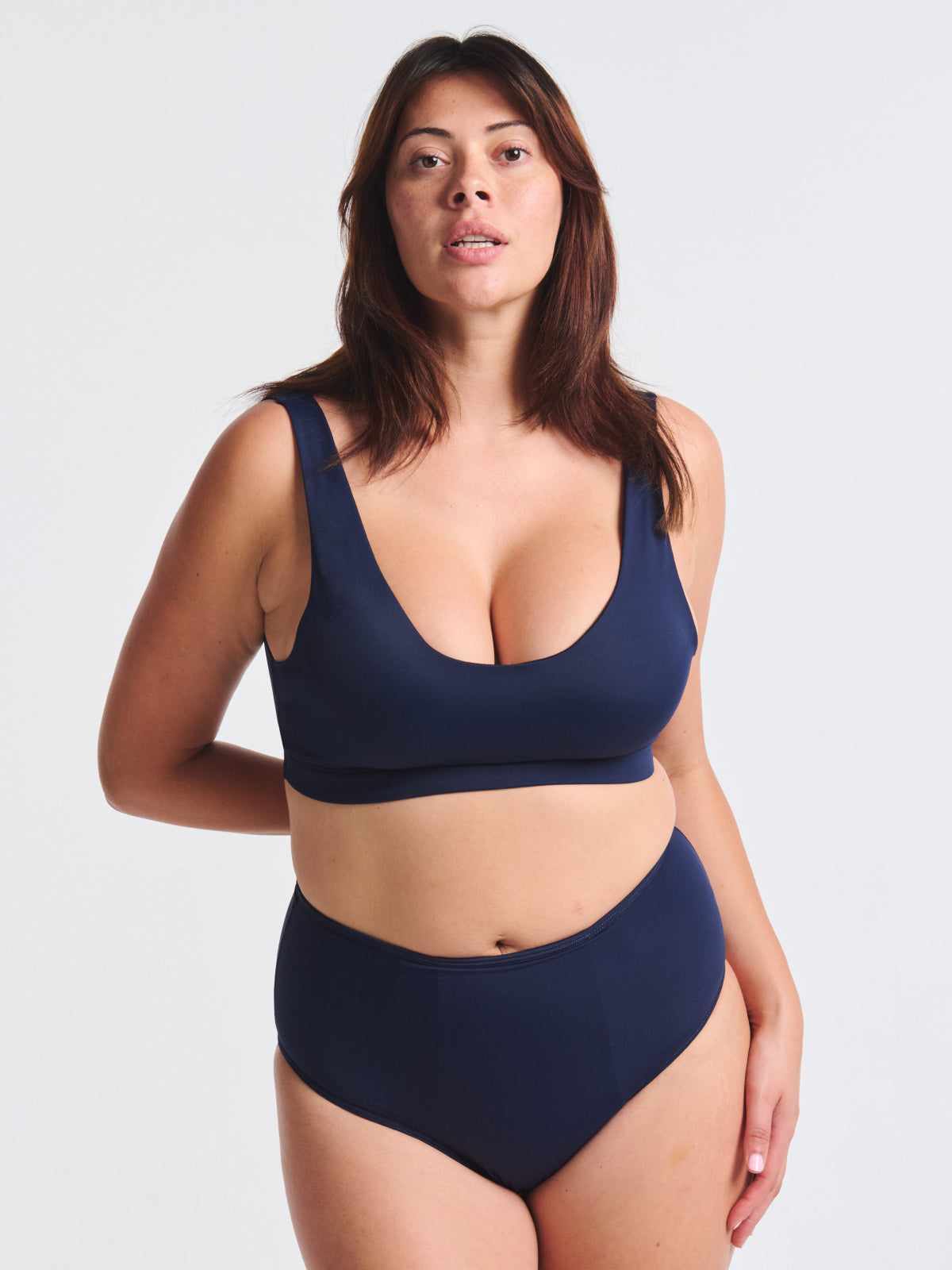 REPEAT propone il suo slip da bikini mestruale a vita alta modellante per tutti i flussi in un blu marino profondo, per offrirti una soluzione elegante, efficace e confortevole che ti permetta di goderti appieno le giornate al mare o in piscina, con o senza ciclo.