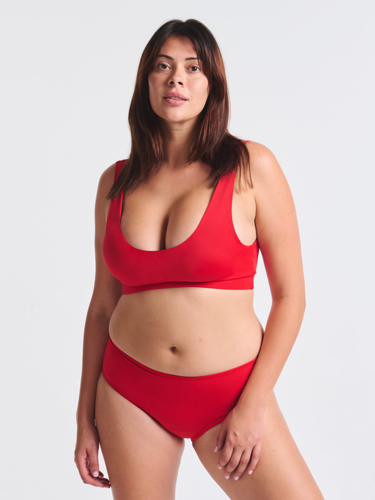 REPEAT presenta il suo slip da bikini mestruale per tutti i flussi, in un taglio shorty coprente e in un vivace rosso, per offrirti la soluzione elegante, efficace e confortevole che meriti per goderti appieno le tue giornate al mare o in piscina, con o senza ciclo.